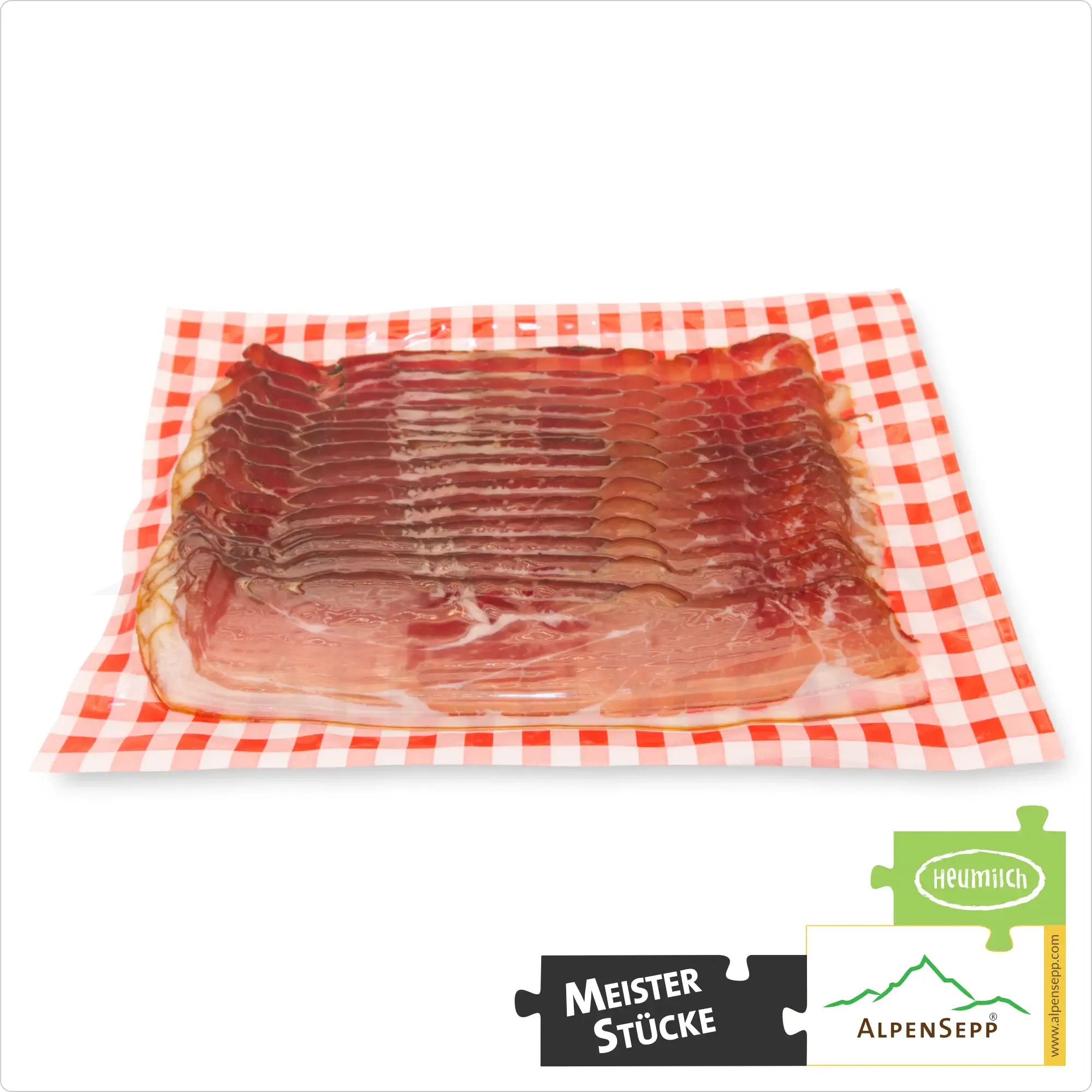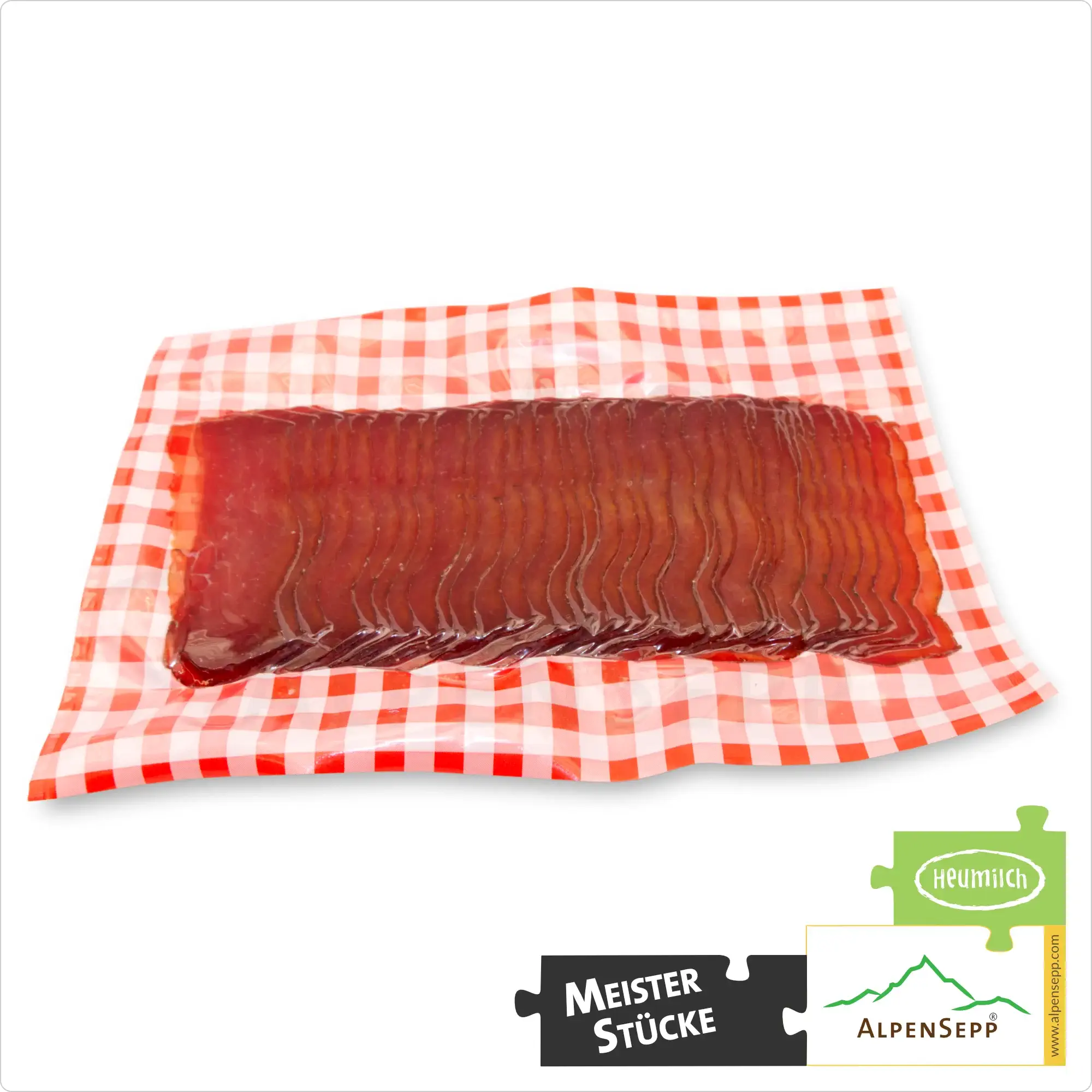 Schweineschale / Schweinekarree – luftgetrocknet und kurz überräuchert mit Wacholderkörner und Blätter verfeinert - 1 Stk. Enzianspeck geschnitten 200 g